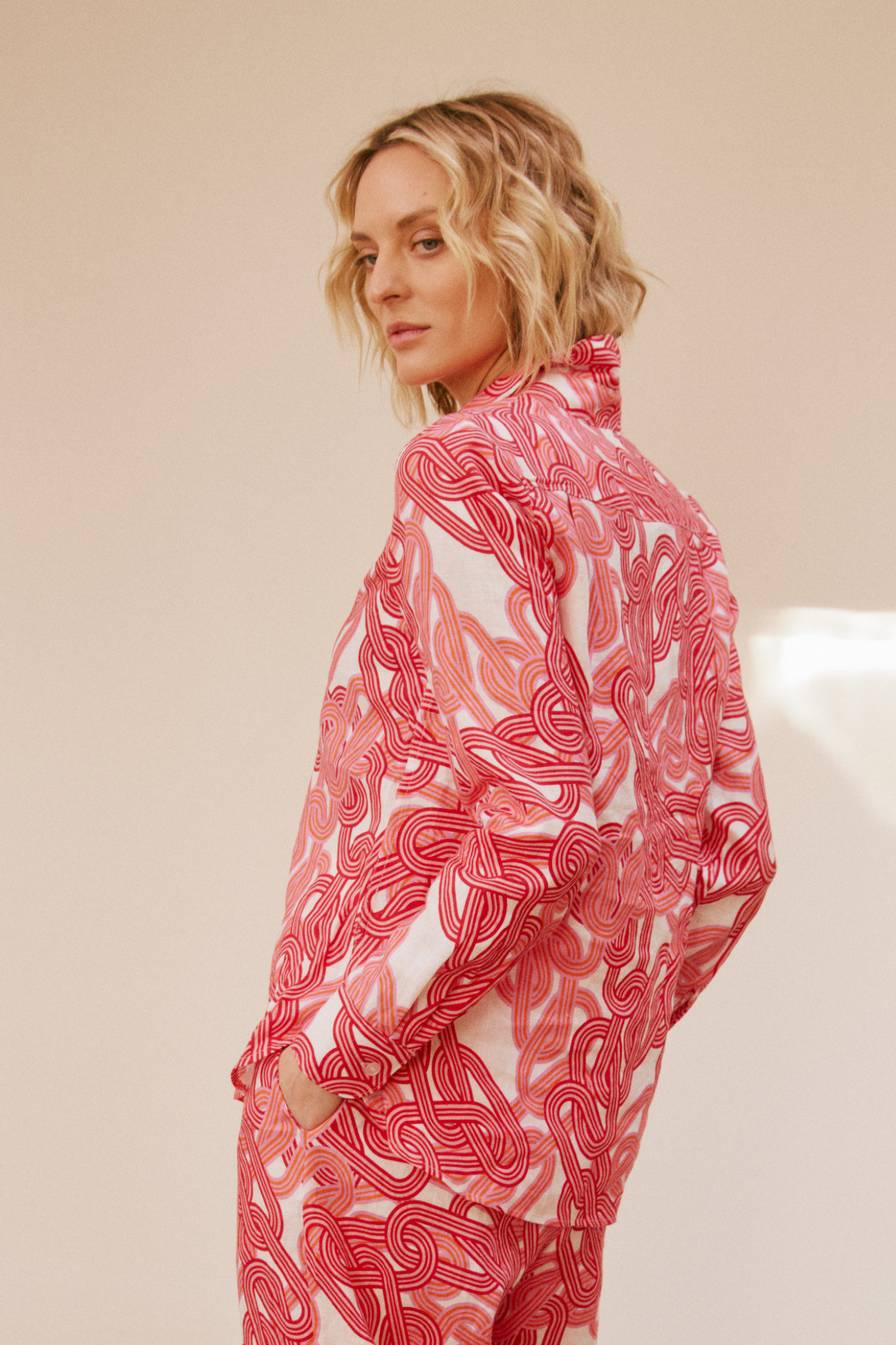 The Infinite Chains print is inspired by the chains found at marinas, adds a unique and symbolic element to the collection. These chains not only evoke imagery of seaside life but also lend a touch of sophistication. Cut in our Classic Shirt style, this piece is great paired back to the matching pant, our solid St. Thomas Pant or even your favourite denim!